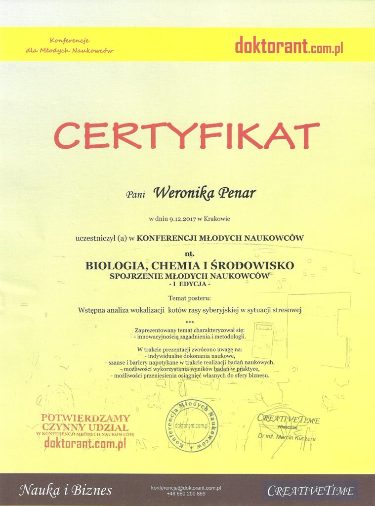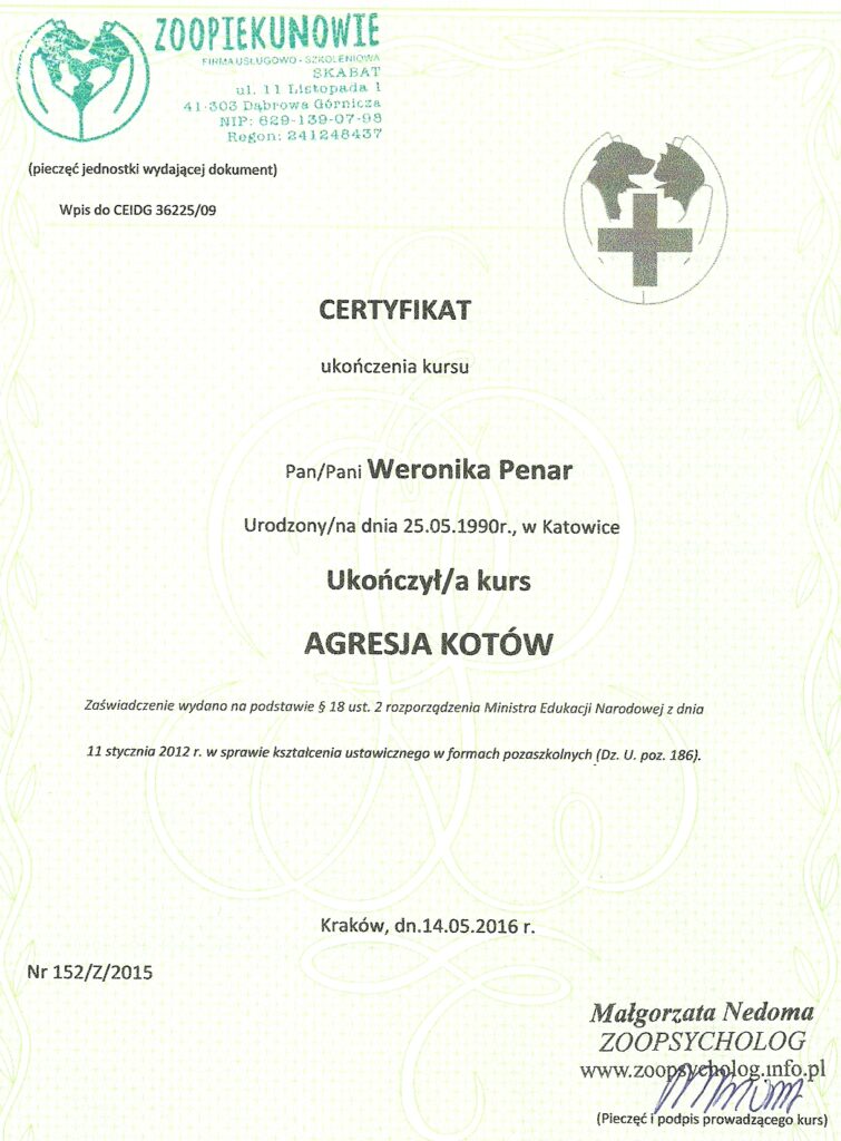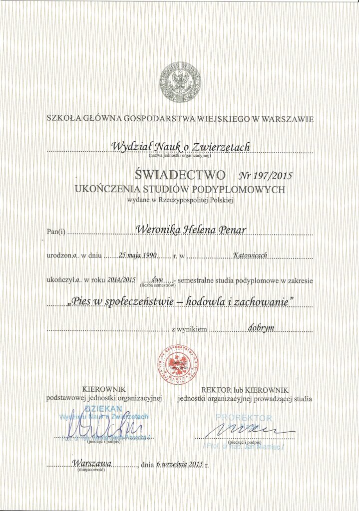 Ukończyłam studia biologiczne, skupiając się na problemach adaptacyjnych i życiu społecznym kotów rasowych. Obroniłam doktorat na Uniwersytecie Rolniczym w Krakowie na temat zdolności poznawczych i komunikacji wokalnej kotów rasowych.